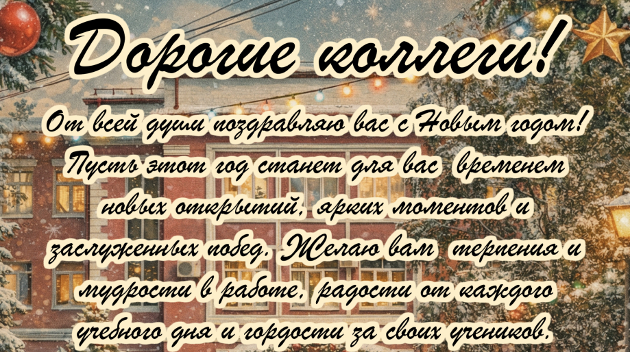 Дорогие коллеги! От всей души поздравляю вас с Новым годом! Пусть этот год станет для вас временем новых открытий, ярких моментов и заслуженных побед. Желаю вам терпения и мудрости в работе, радости от каждого учебного дня и гордости за своих учеников. Пусть в ваших домах будет тепло и уютно, а…