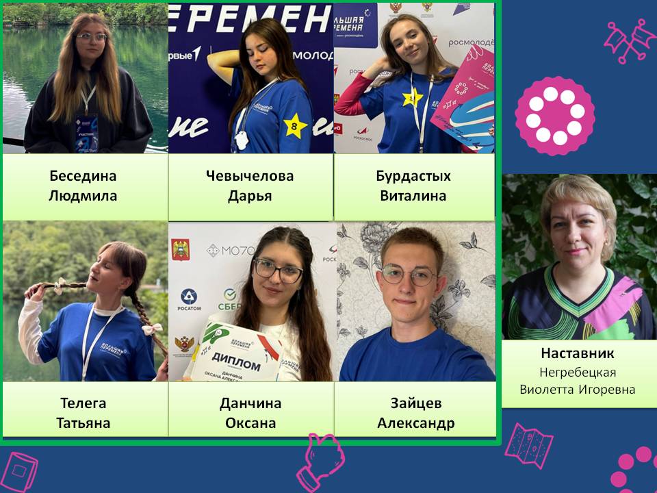 — Зайцев Александр, Бурдастых Виталина, Чевычелова Дарья, Данчина Оксана, Беседина Людмила, Телега Татьяна – наставник В.И. Негребецкая;