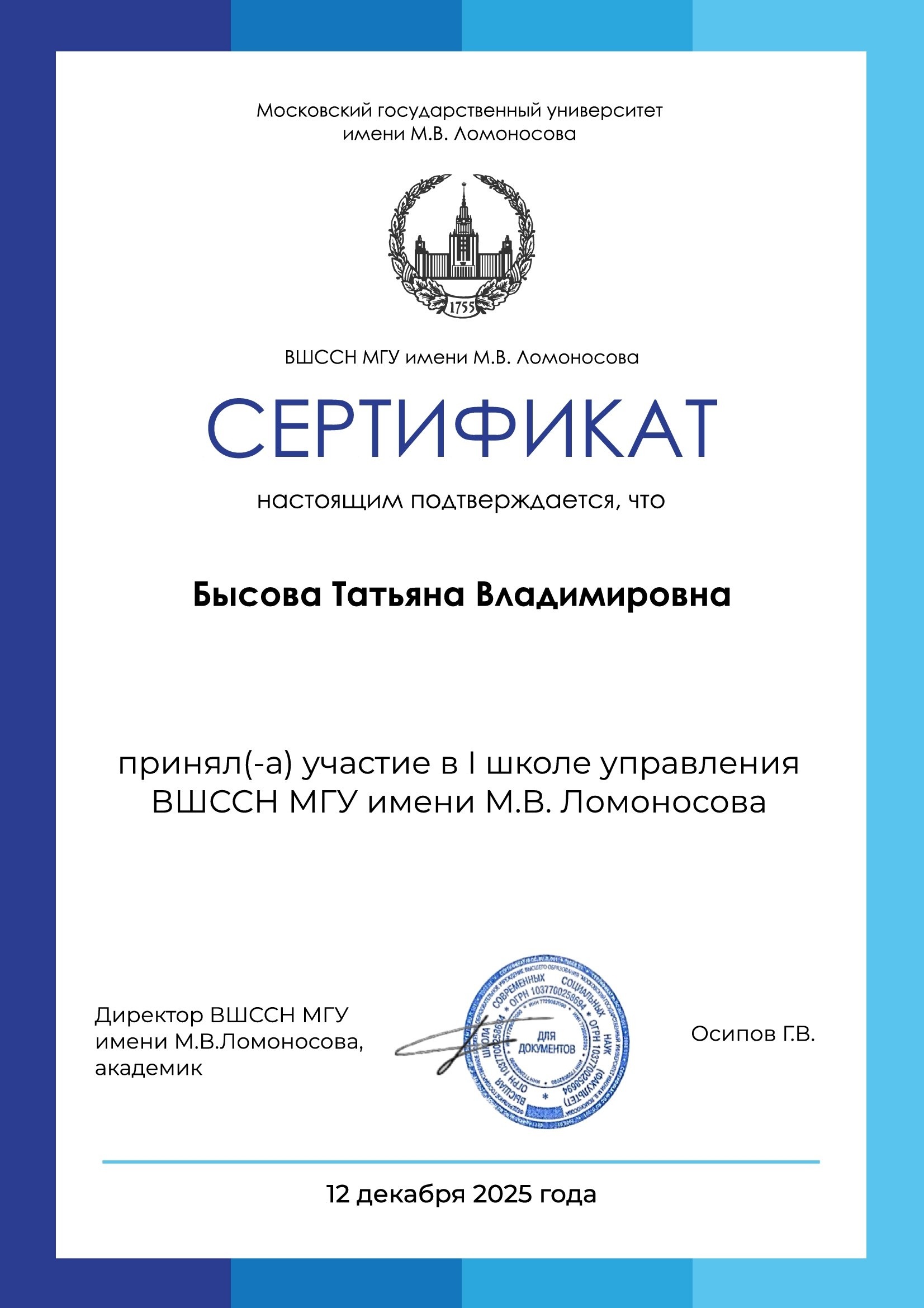 12 декабря состоялась онлайн-сессия I Школы управления Высшей школы стратегического развития и налоговых систем МГУ имени М.В. Ломоносова (ВШССН МГУ). Это событие стало важной вехой на пути формирования компетентной управленческой команды и площадкой для обмена опытом между представителями крупных организаций. В мероприятии приняли участие преподаватели нашего колледжа Бысова Т.В. и Зиборова С.Ю.